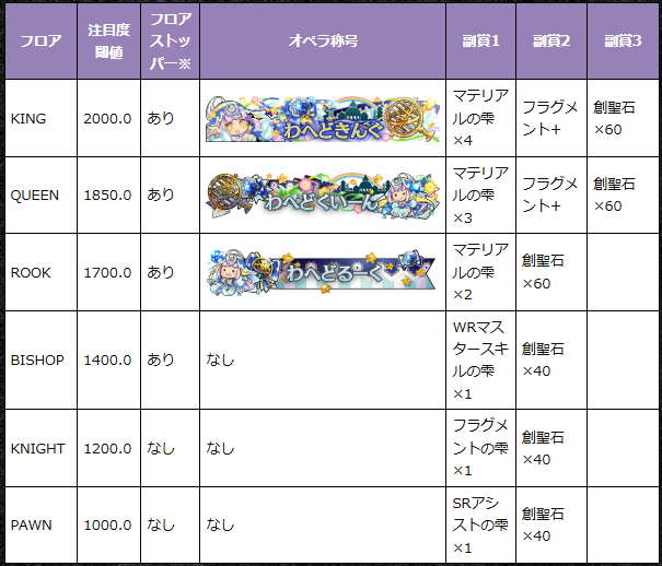 ※フロアストッパーとは、一定のフロア(キング・クイーン・ルーク・ビショップ)に到達すると、イベント中はそのフロアより下に降格しなくなります。