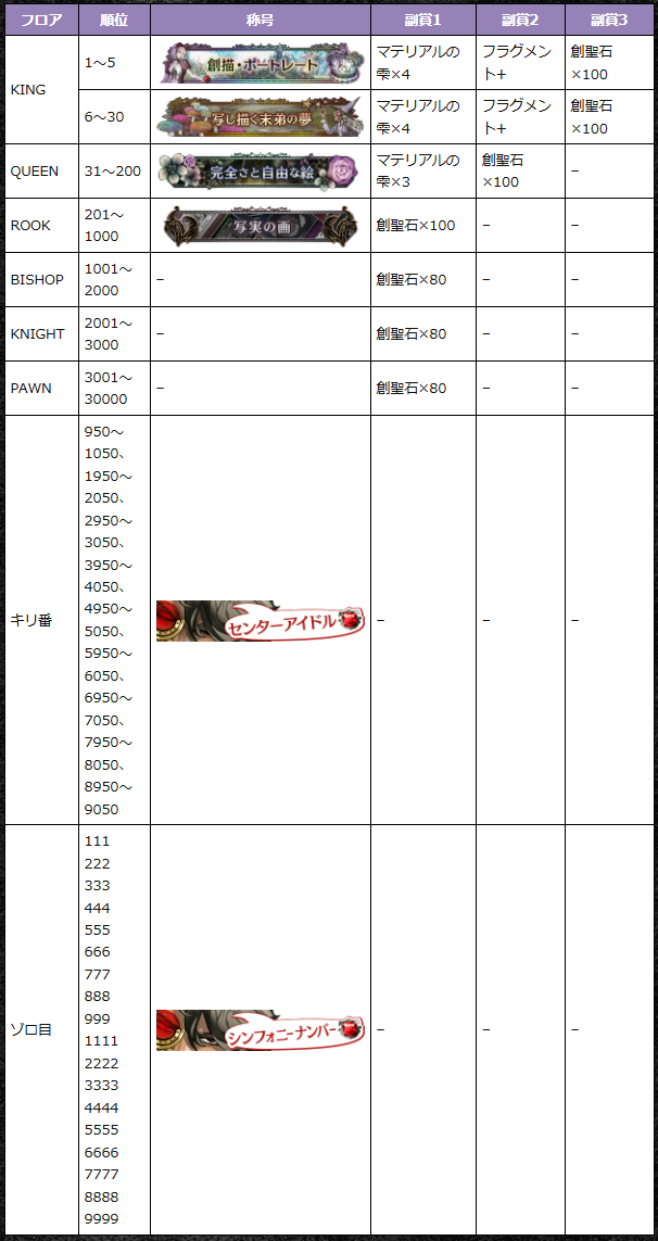 ・複数のユニットで参加した場合、順位による褒賞(称号含む)は、もっとも順位の高かったユニットのランキング褒賞のみ授与されます。